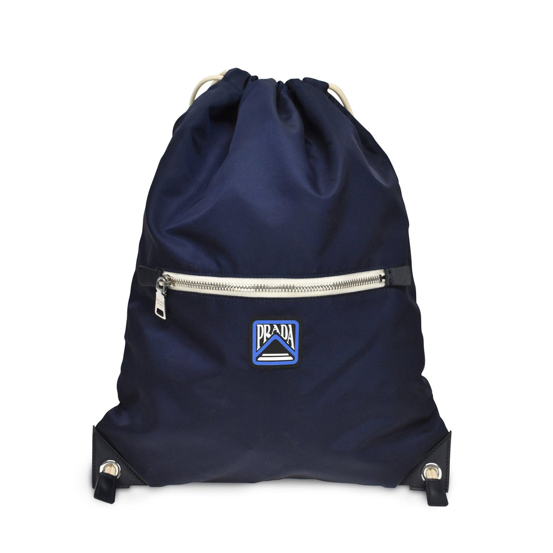 Prada drawstring backpack in a navy nylon material with leather detailing, a front zip pocket,...