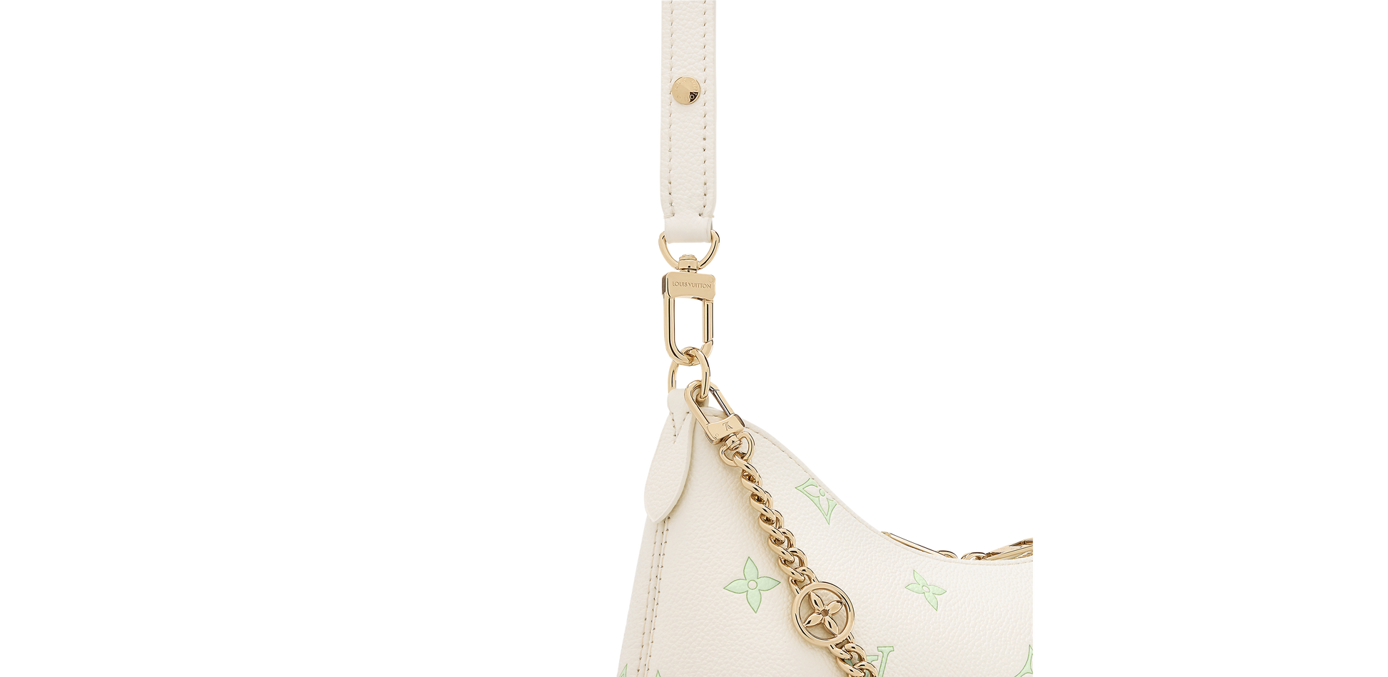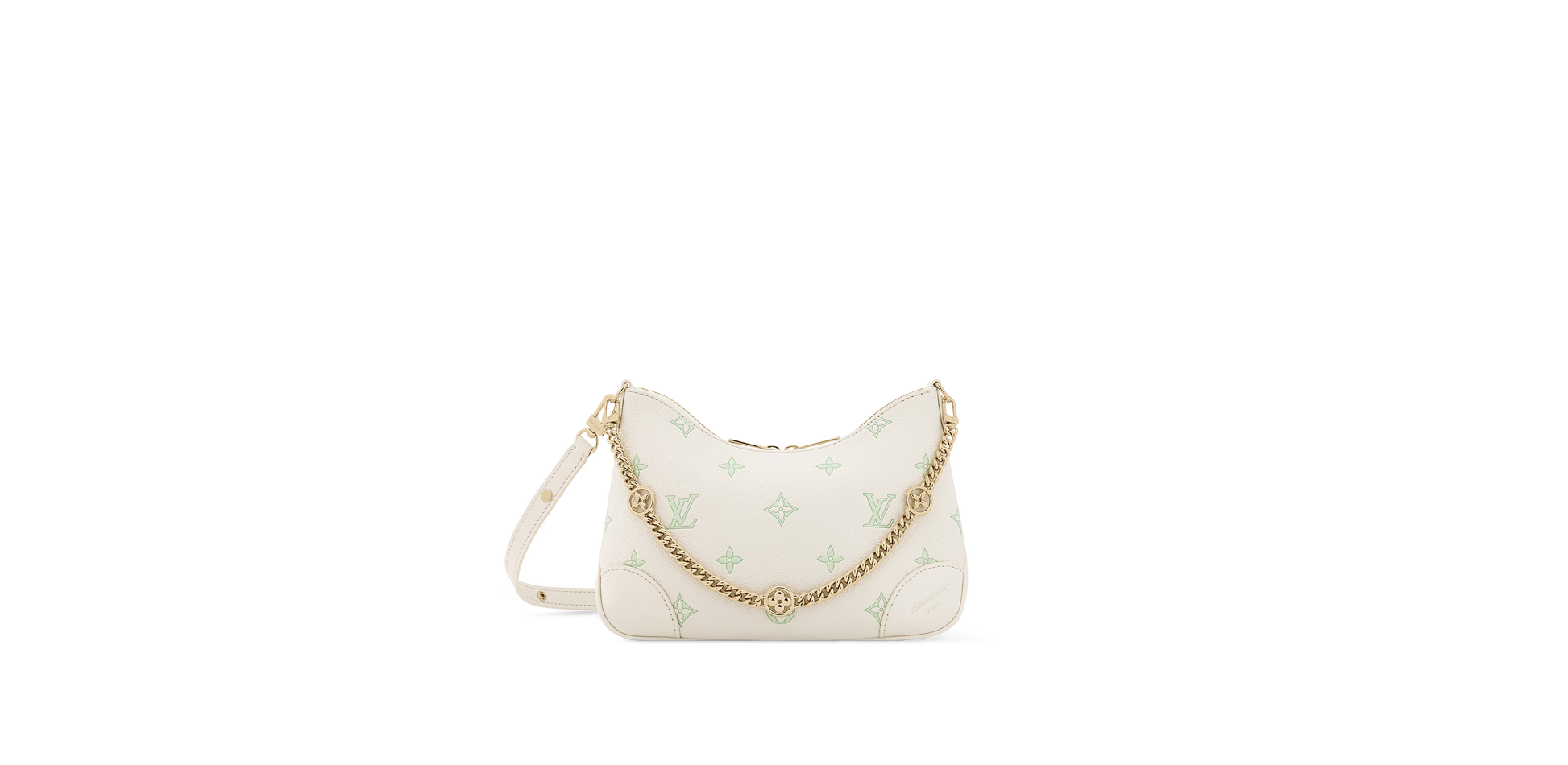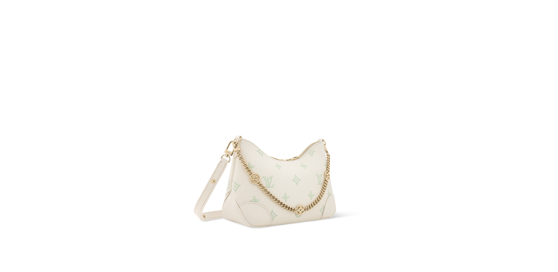 The House presents this dreamy bi-color palette on the Boulogne handbag, which strikes the perfect balance of elegance and contemporary style. It is crafted from Milky White and Green leather, which is embossed with the signature Monogram and adorned with a light gold-toned, LV flower-embellished chain. The longer strap can be removed if desired, and there is plenty of room inside for small everyday items.