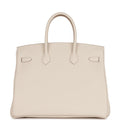 This Birkin is in Craie togo leather with rose gold hardware and has tonal stitching, front flap, two straps with center toggle closure, clochette with lock and two keys, and double rolled handles.