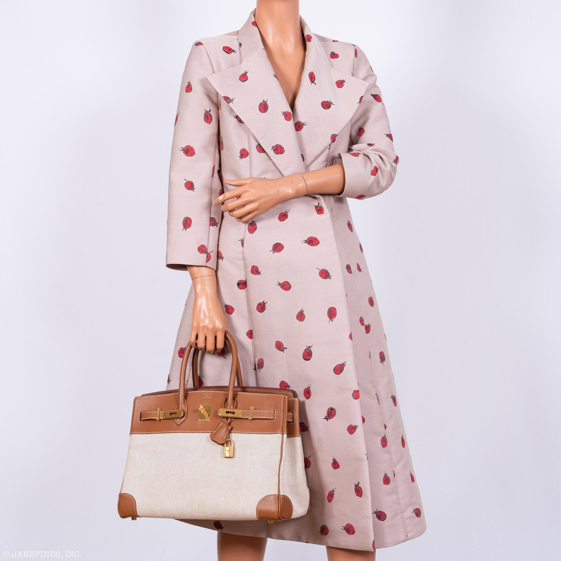 Natural Toile GM canvas Hermès Birkin 35 with gold hardware, Gold Epsom leather trim, dual rolled top handles, dual pockets; one with zip closure at interior walls and turn-lock closure at front flap. Includes lock, keys, clochette and dust bags.