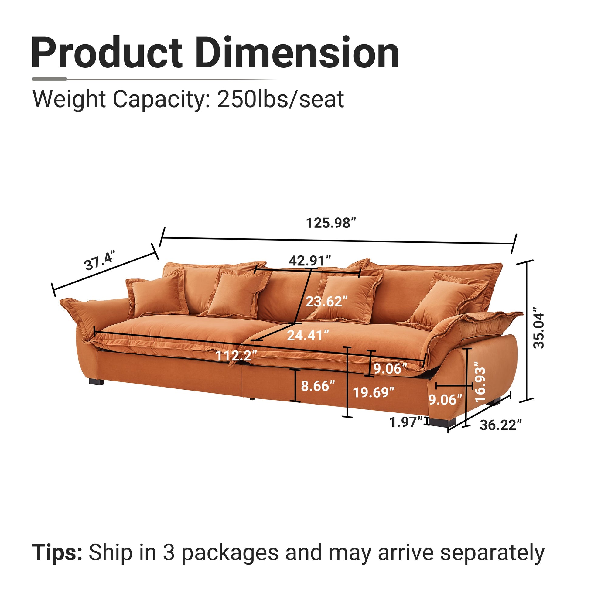 - 【Modern Modular Sofa】 37.4'D x 125.98'W x 35.04'H, seat depth: 24.41', Seat Height: 19.69'. It's perfect for any room, be it your living room, family room, bedroom or office - meet all your seating needs in one couch.Constructed from a sturdy solid wood frame, the cushions are filled with high-density sponge, which enhances the elasticity of the sofa.