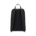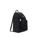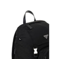 Re-Nylon Backpack by Prada, enamel triangle with brand logo appliqué on front, round handle, double adjustable shoulder straps, front flap closure, drawstring closure, zippered pockets, mesh panels, single compartment, and interior zippered pocket.