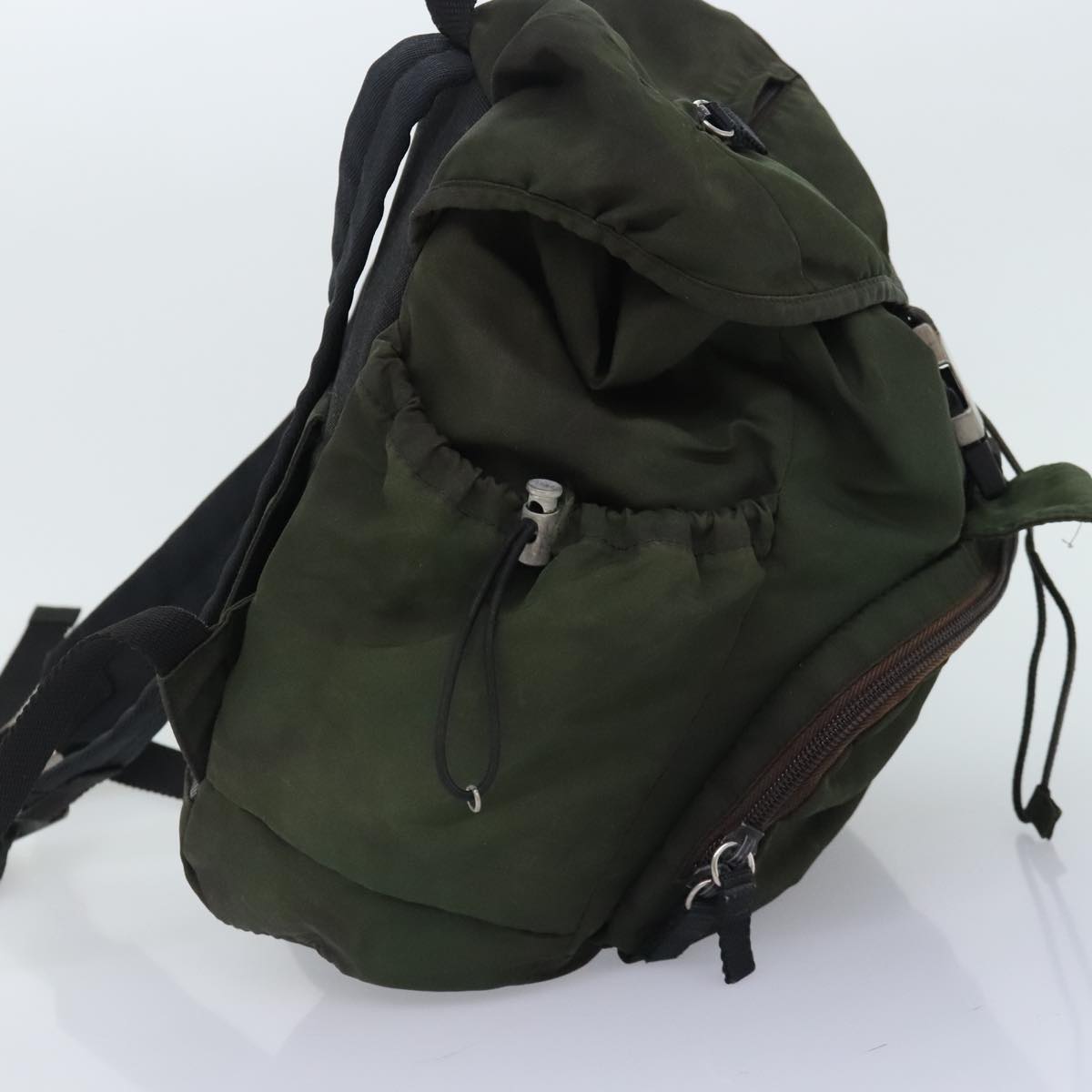 Brand - PradaModel - Re-NylonColor - KhakiMaterial - SyntheticInclusions - CardDimensions - W26cm x H30cm x D12cm(Approx)Serial number - 33Country of origin - ItalyCondition - B - good condition.Outside condition - lose shape , rubbing , slight stain , partly PeelingInside condition - rubbing, stainHandle condition - rubbingCorner condition - rubbingMetal fittings condition - scratchesSize - One Size