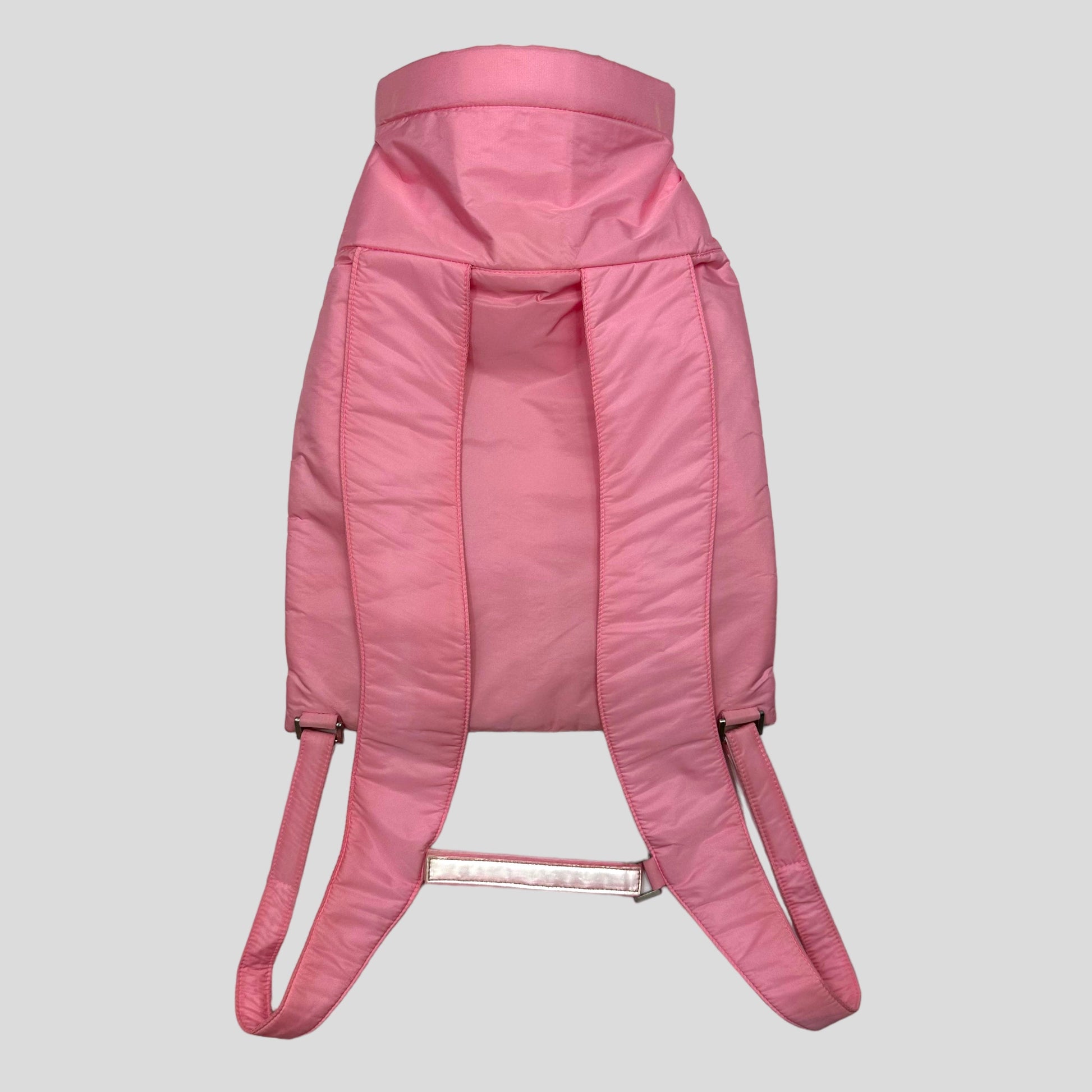Extremely rare spring summer 1999 baby pink nylon technical backpack, features 3m reflective strap and chest strap detailing, roll top bucket belt closure design, finished with the red prada tab logo.