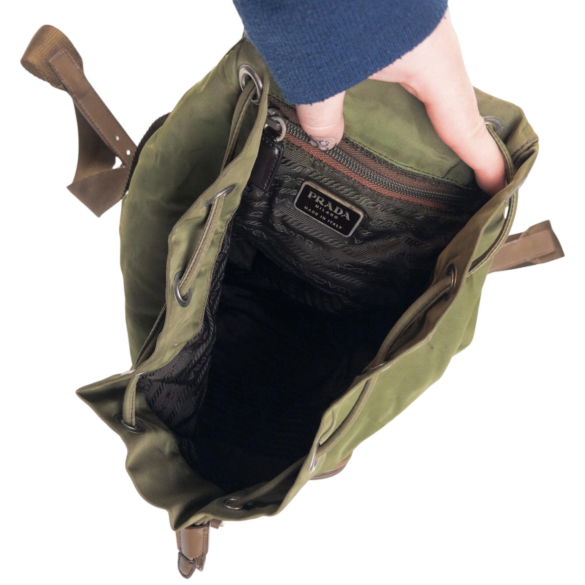 • Other info: Green colour, drawstring bucket closure, prada symbole plate, visible discoloured marks and wear as shown