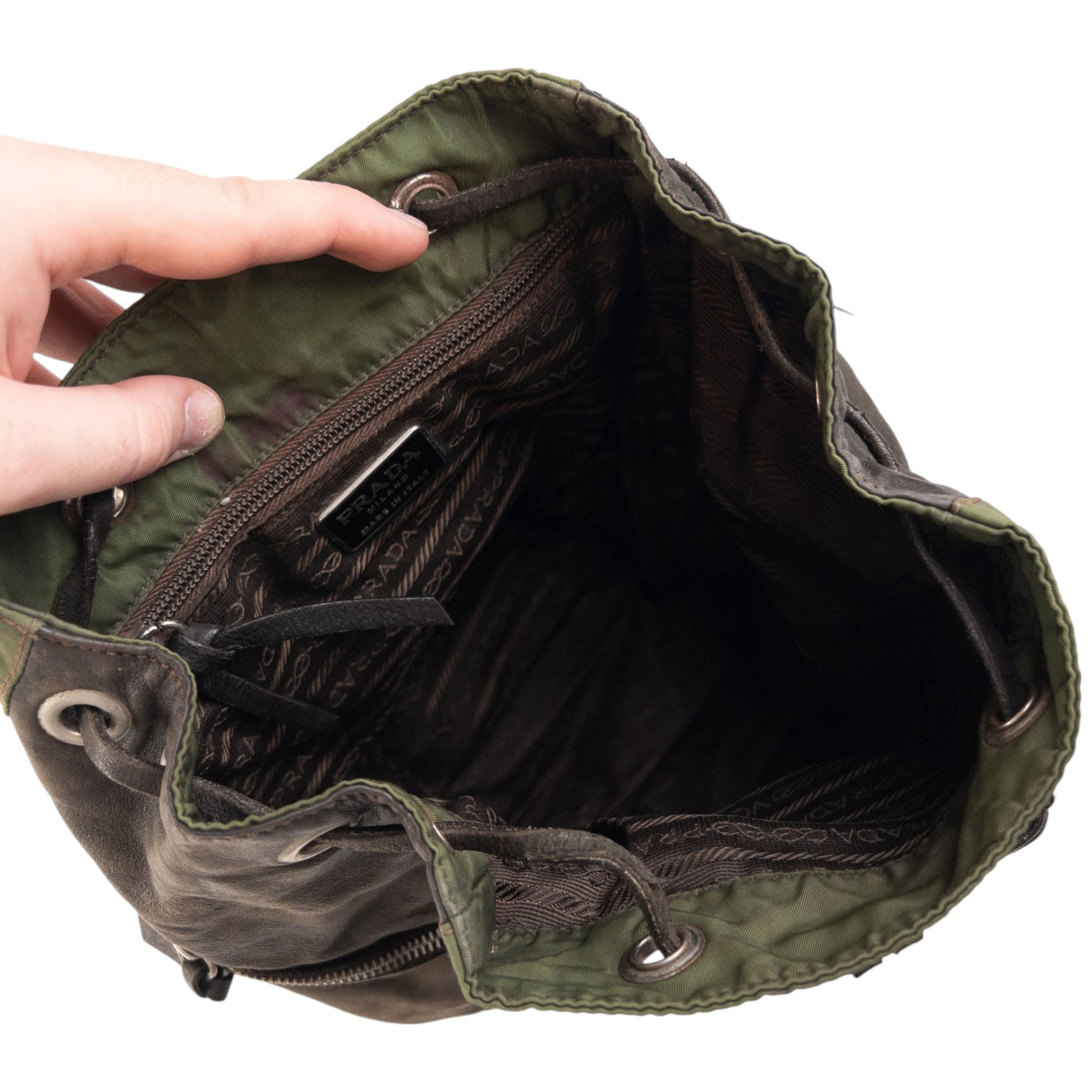 - Other info: Green colour, brown accent colour, prada symbole plate, drawstring closure, visible wear and flaking as seen, discoloured areas and marks as shown, fixed stitching damage as seen